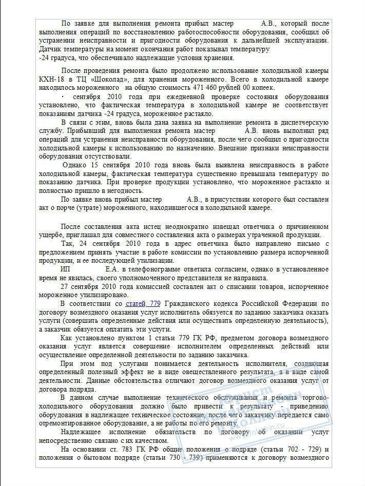- Причинно-следственная связь. Из-за неисправности холодильной камеры температура хранения не соответствовала норме, в результате чего мороженое растаяло. Это подтверждено актом о порче от 15 сентября 2010 года, составленным в присутствии мастера ответчика, и актом о списании товара от 27 сентября 2010 года.