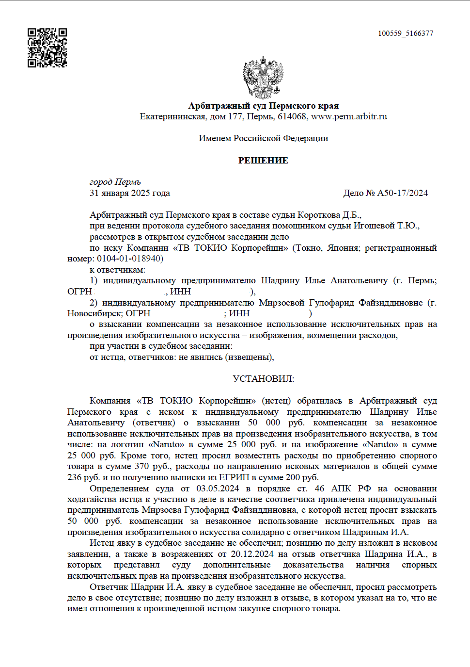 Иск был подан компанией «TV Tokyo Corporation» к двум индивидуальным предпринимателям, включая нашего клиента. Истец требовал взыскания компенсации за нарушение авторских прав, ссылаясь на своё эксклюзивное владение образами из аниме «Naruto». Ни истец, ни ответчики лично в заседаниях не участвовали, поэтому исход дела полностью зависел от качества представленных письменных доказательств и правовой аргументации.
