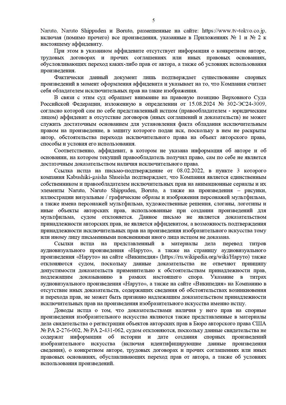 - Недостаточность доказательств права собственности. Истец предоставил аффидевит (заявление под присягой), письмо от партнёрской компании, скриншоты из «Википедии» и американские свидетельства о регистрации. Суд, вслед за нашей позицией и ссылаясь на практику Верховного Суда РФ, установил, что ни один из этих документов не подтверждает цепочку перехода прав от конкретного автора (художника) к японской корпорации. В них не указаны имена авторов, нет трудовых договоров или лицензионных соглашений – ключевых для российского суда документов.