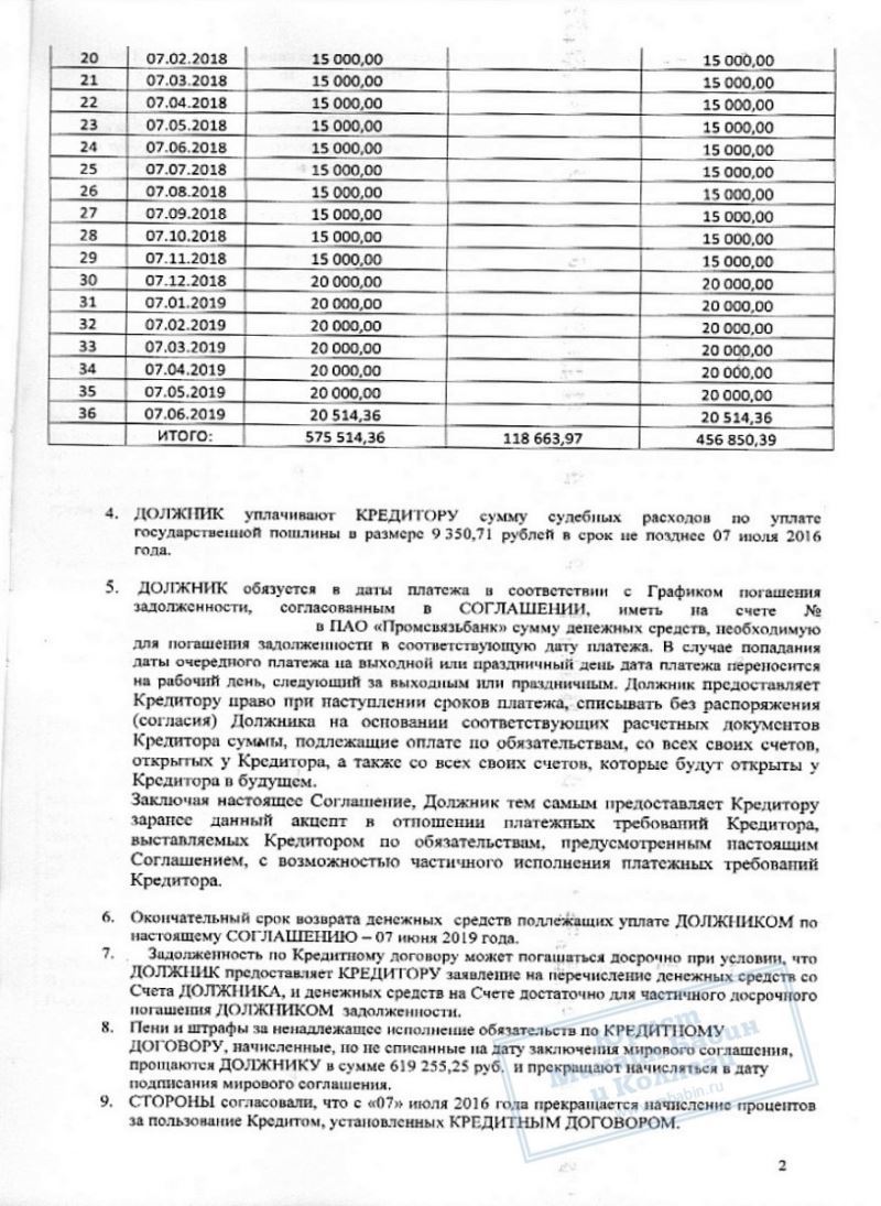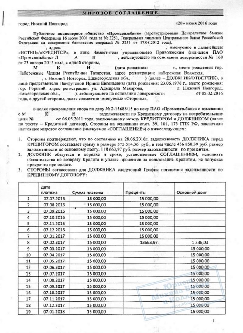 Наш юрист провел переговоры с кредитной организацией таким образом, что дело было закрыто без обращения в суд. Между кредитором и должником было заключено мировое соглашение, согласно которому банк прощал М.К. 619 000 руб., а на возврат оставшейся суммы дал отсрочку на 3 года. При этом, к оставшейся сумме не были прибавлены дополнительные банковские проценты.