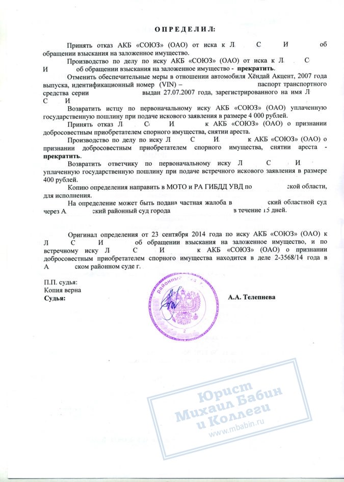 Гражданин Л. приобрел автомобиль по дубликату ПТС. Впоследствии выяснилось, что прежние владельцы купили его в кредит и он по-прежнему находится в залоге у банка АКБ «СОЮЗ» (ОАО). Кредит остался непогашенным, и на автомобиль был наложен арест. Новый владелец машины обратился к нам за помощью.