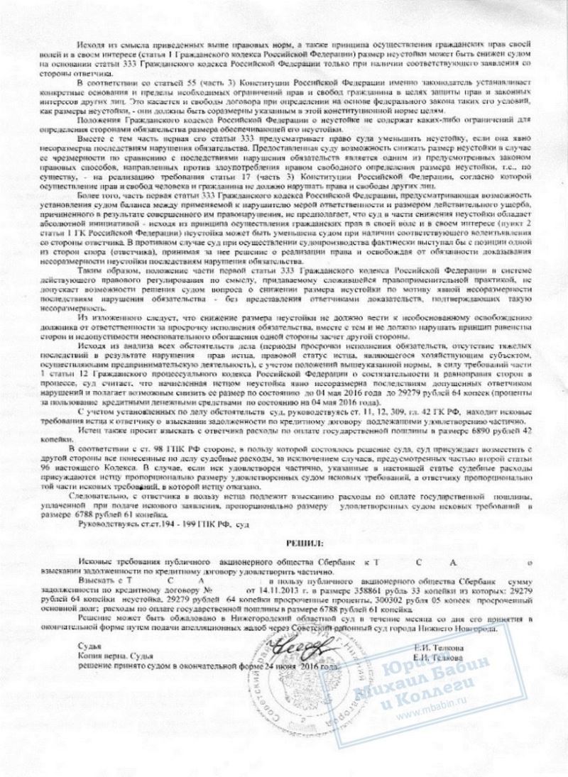 Юрист обжаловал в суде размер неустойки за просрочку по кредиту, как несоразмерную. Суд постановил уменьшить ее на 10 000 рублей.