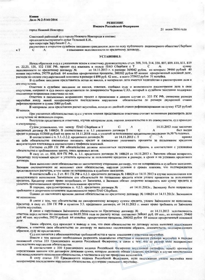 С.Т. обратился за помощью к юристу нашей компании, в связи с просроченным кредитом в банке "Сбербанк". Штрафные санкции банка оказались чрезмерными, на что и указал в суде кредитный юрист. В результате размер неустойки за просроченный кредит был уменьшен судом на 10 000 рублей.