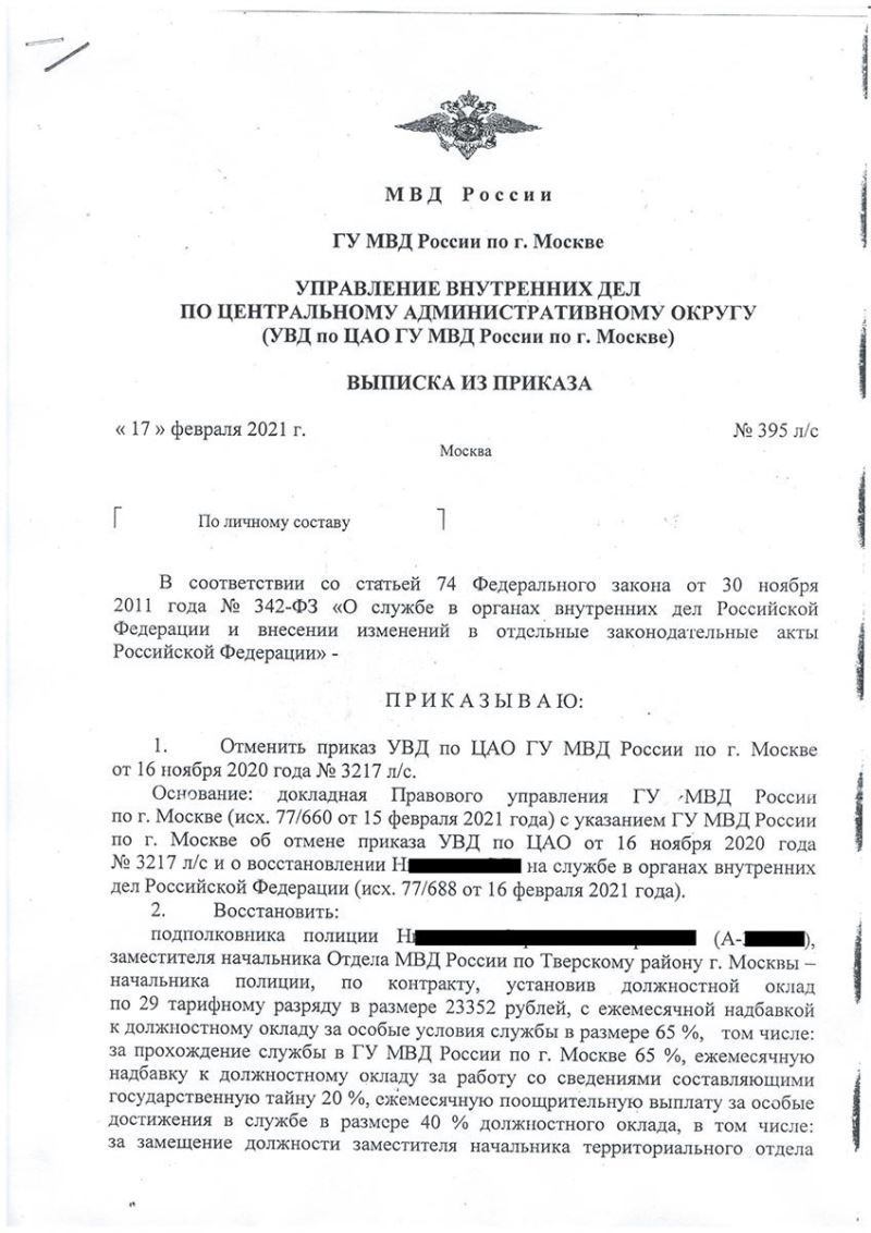 Клиента Н., прослужившего более 30 лет в системе МВД РФ, незаконно уволили, якобы в связи с нарушением должностных обязанностей, в связи с чем клиент не получил полагающиеся при увольнении выплаты и не мог найти новое место работы.