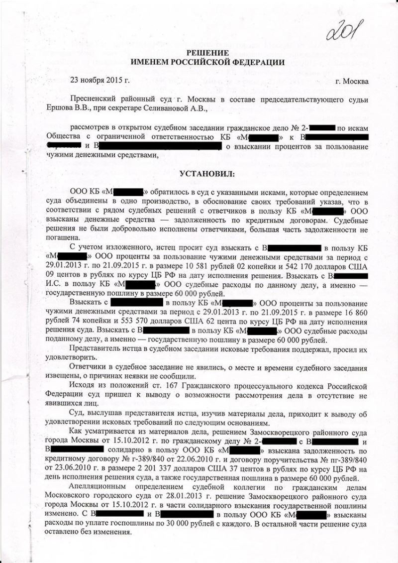 Находящийся на абонентском обслуживании у адвоката коммерческий банк, в лице председателя правления, обратился с просьбой рассчитать и взыскать с должников проценты за пользование чужими денежными средствами по крупной кредитной задолженности.