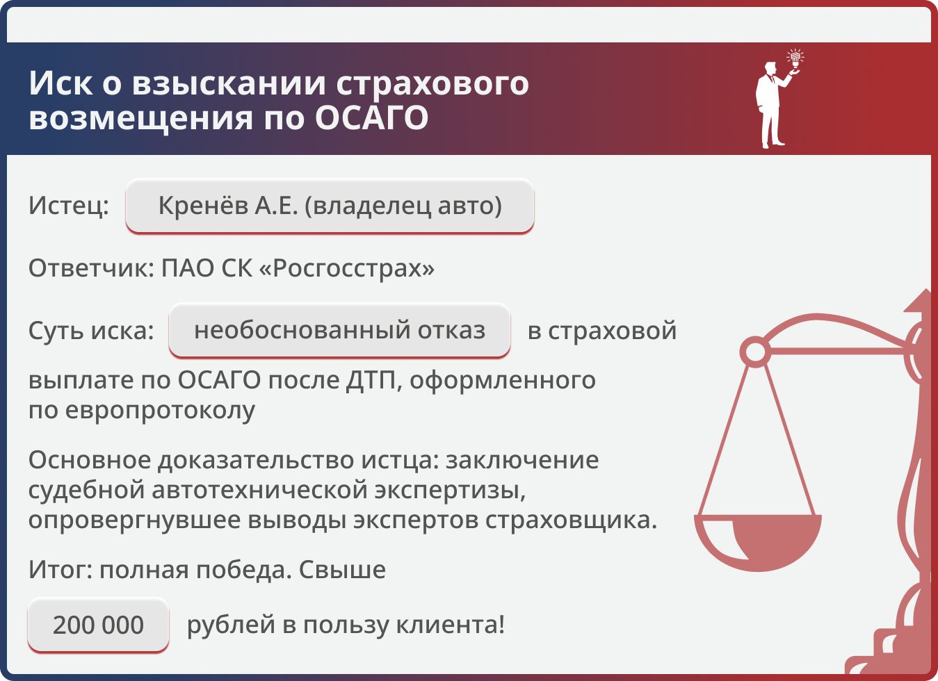 Это дело наглядно показывает, что правильная юридическая тактика и настойчивость в доказывании, особенно через судебную экспертизу, гарантированно побеждают необоснованный отказ страховой компании.