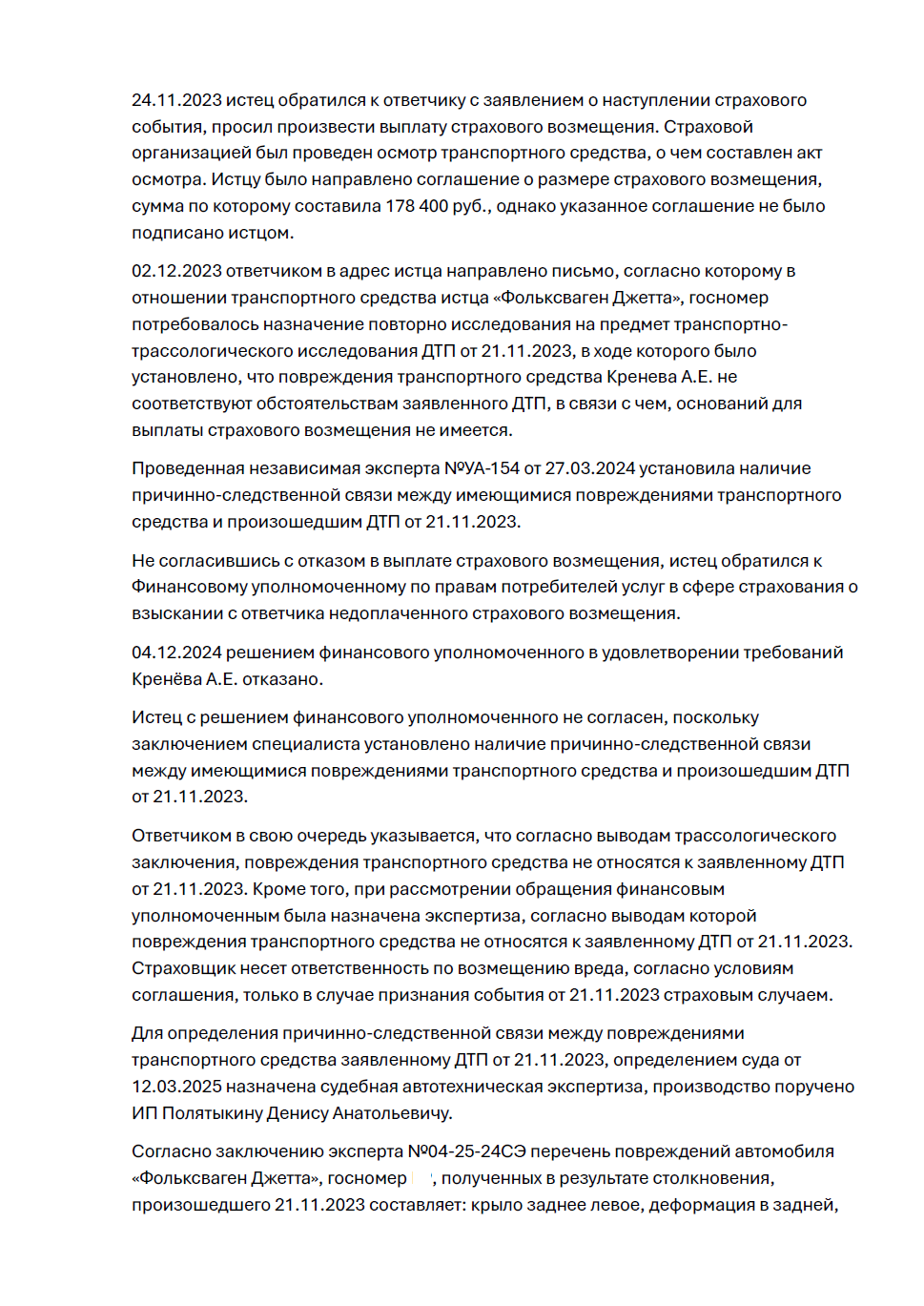 Мы инициировали и настояли на проведении судебной автотехнической экспертизы, которая, в отличие от заочных исследований страховой компании, основывалась на реальном осмотре автомобиля. Её вывод о наличии причинно-следственной связи стал центральным неопровержимым аргументом. Параллельно мы выстроили позицию на взыскание не только основного возмещения, но и всей сопутствующей ответственности страховщика за необоснованный отказ и просрочку.