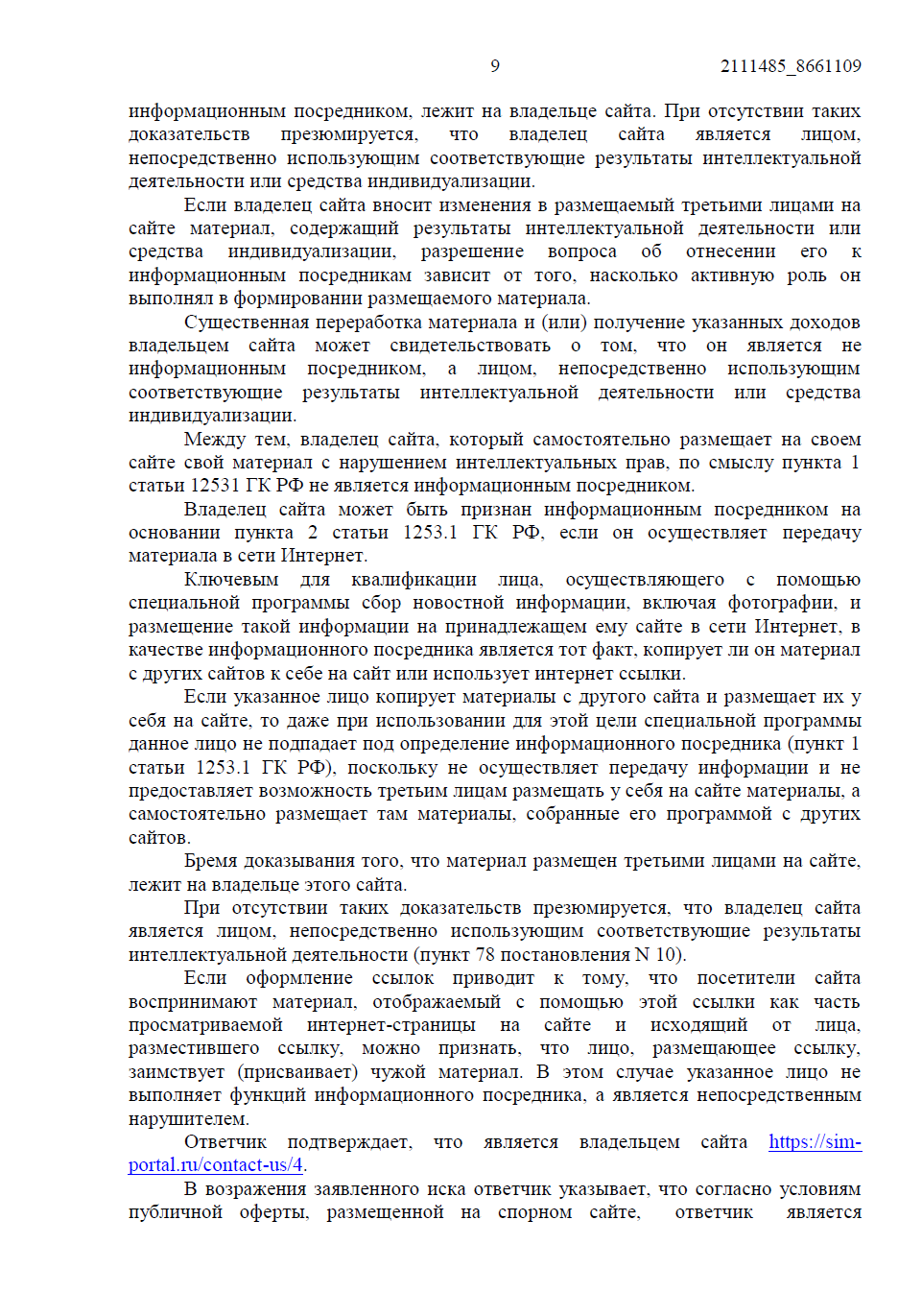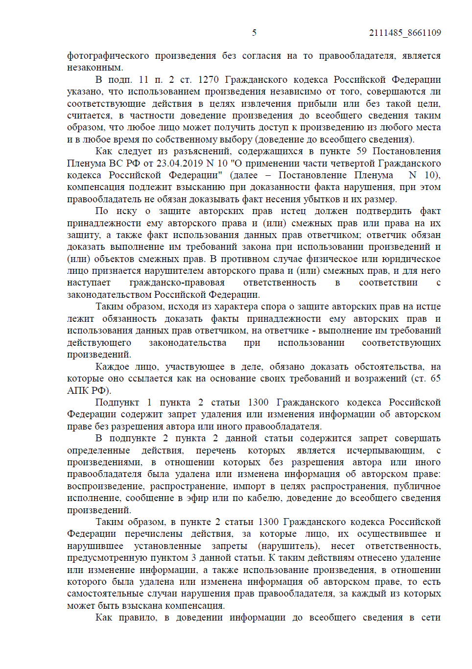 Ответчик не знал о неправомерности использования произведения, а после получения претензии принял меры по модерации контента. Также защита указывала, что размещение одного и того же произведения на двух страницах сайта охватывается единством намерений и должно рассматриваться как одно нарушение.