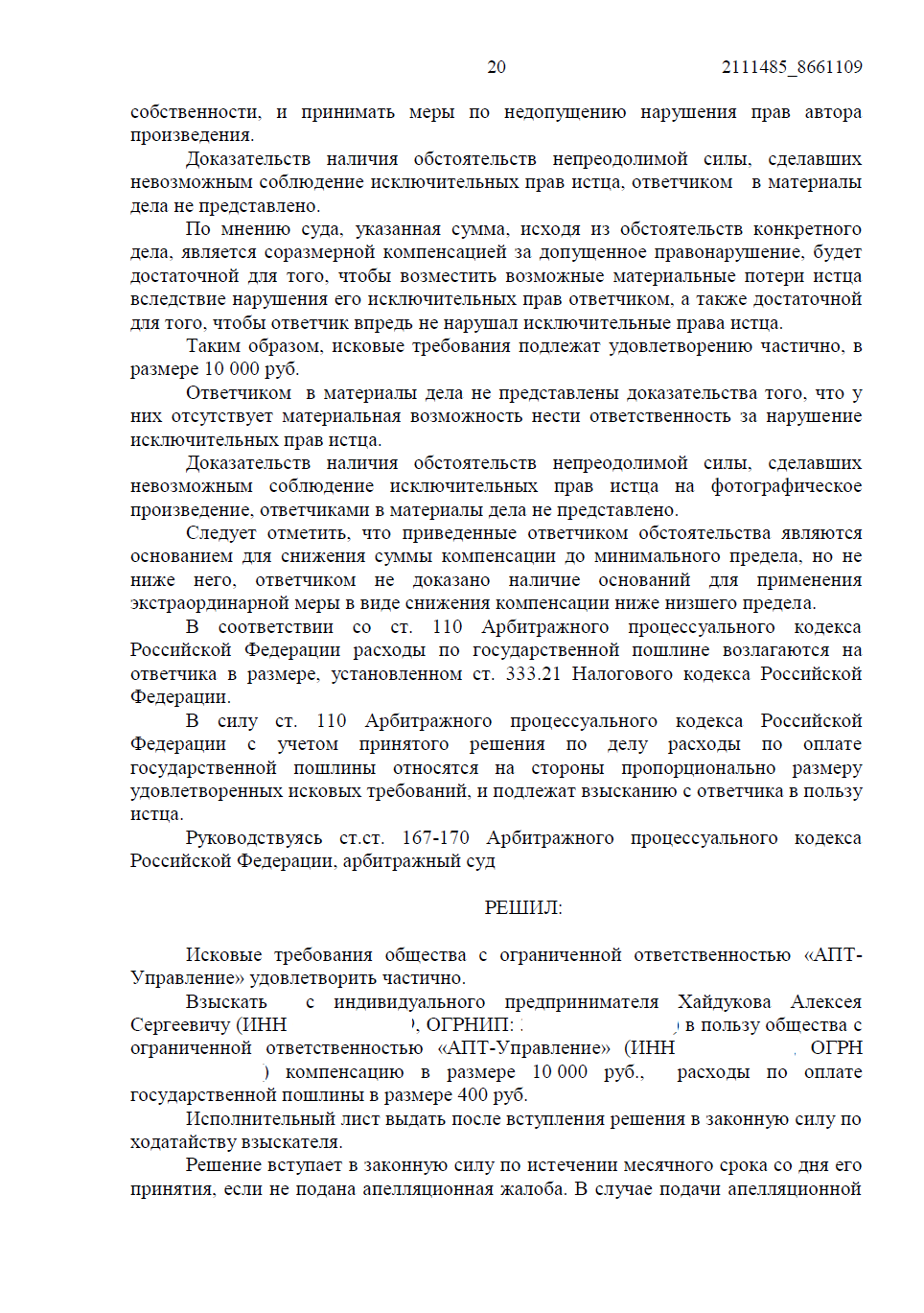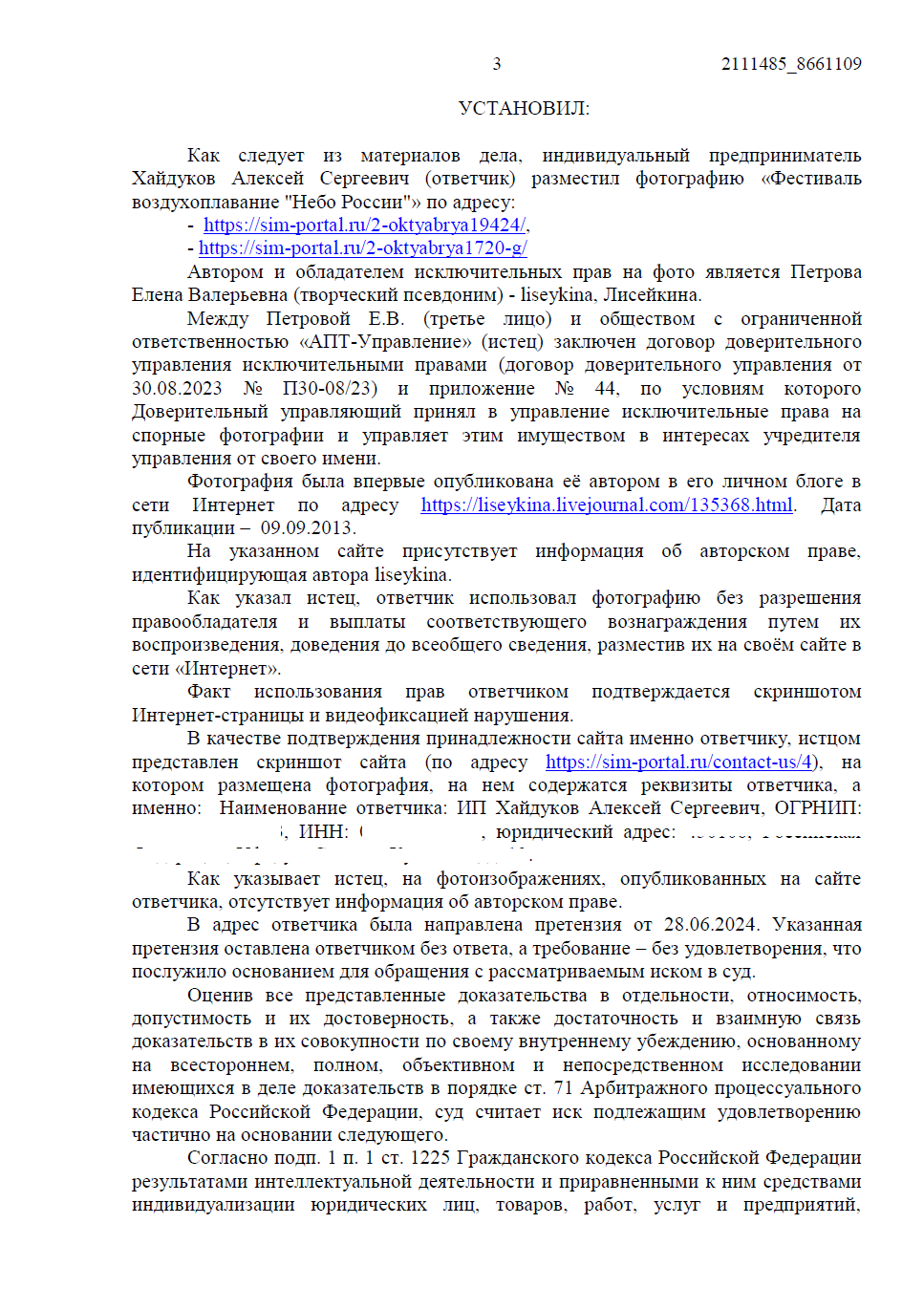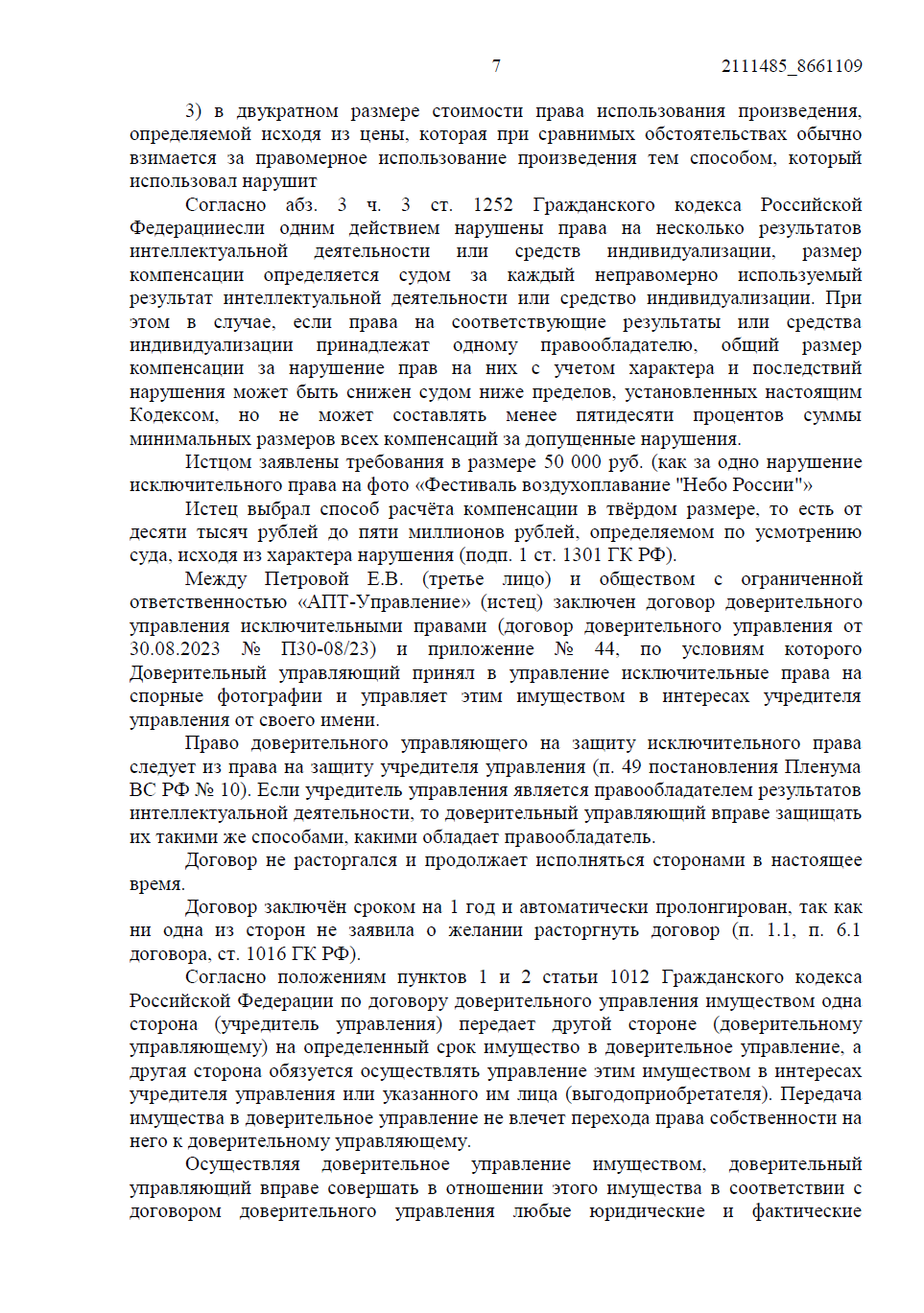 Истец (ООО «АПТ-Управление») обратился в суд с иском к ИП о взыскании 50 000 руб. компенсации за нарушение исключительных прав на фотографическое произведение «Фестиваль воздухоплавания "Небо России"». Основание — размещение фотографии на двух страницах сайта sim-portal.ru, принадлежащего ответчику.