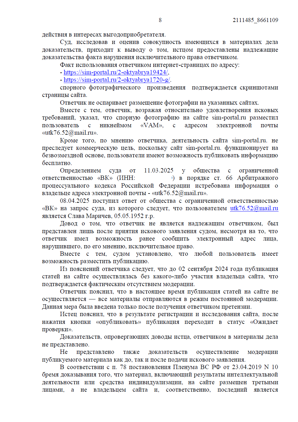 Дело рассматривалось в Арбитражном суде Республики Башкортостан. Защита настаивала на том, что ответчик является информационным посредником, поскольку спорная фотография была размещена пользователем с ником «VAM», а не самим владельцем сайта.