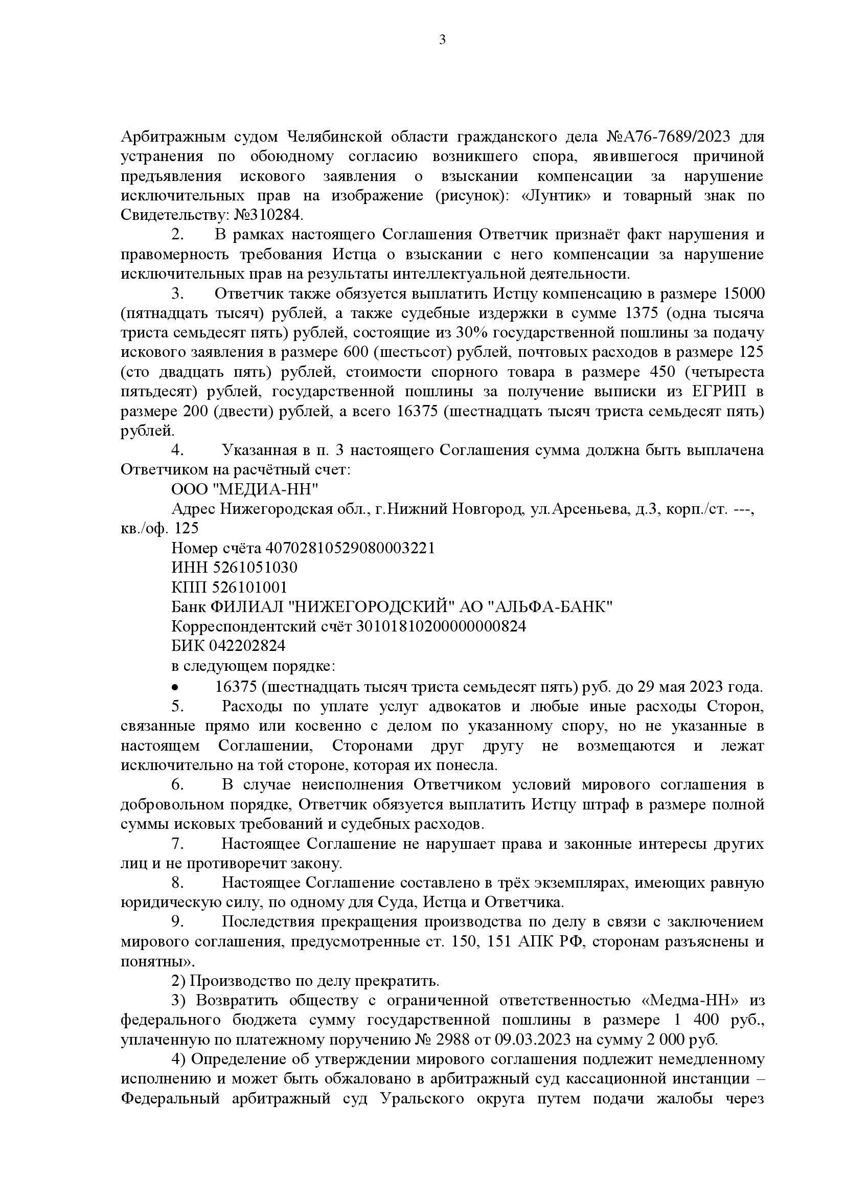 Правообладатель требовал компенсацию за нарушение прав на товарный знак и изображение «Лунтик». Юристы компании инициировали переговоры и подготовили мировое соглашение, по которому компенсация снижена более чем в 3 раза — до 15 000 руб.