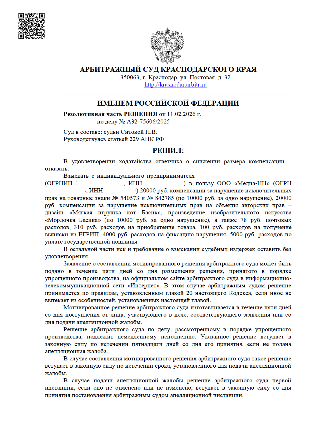 Истец требовал 80 000 руб. за нарушение прав на товарные знаки и авторские права, связанные с популярным персонажем «Кот Басик». Юристы компании убедили суд в несоразмерности суммы, и компенсация снижена вдвое.