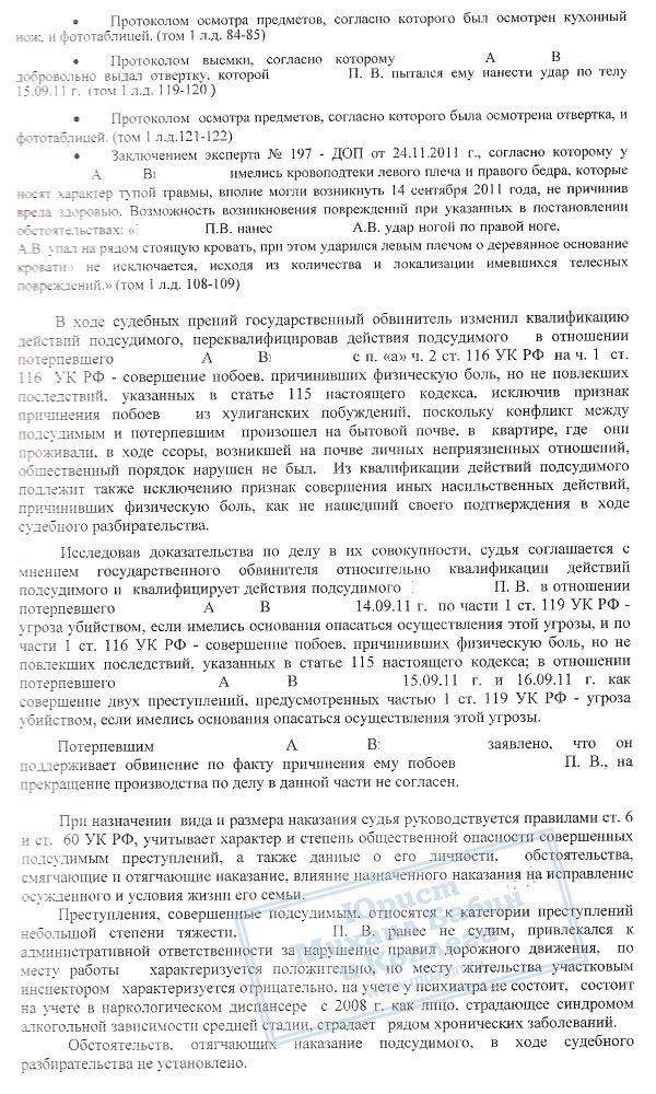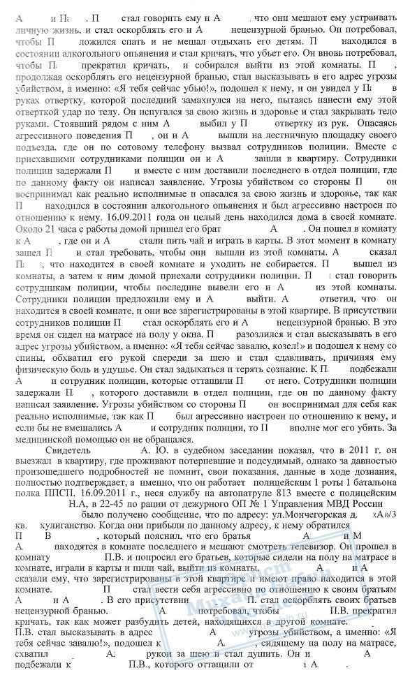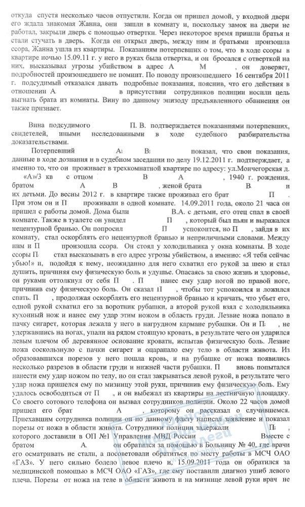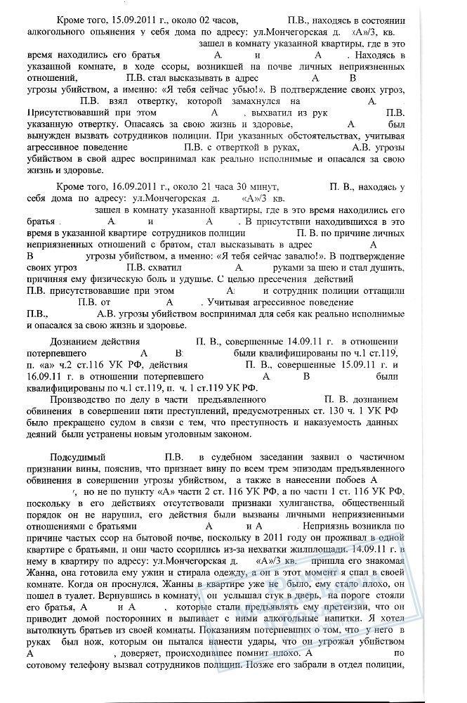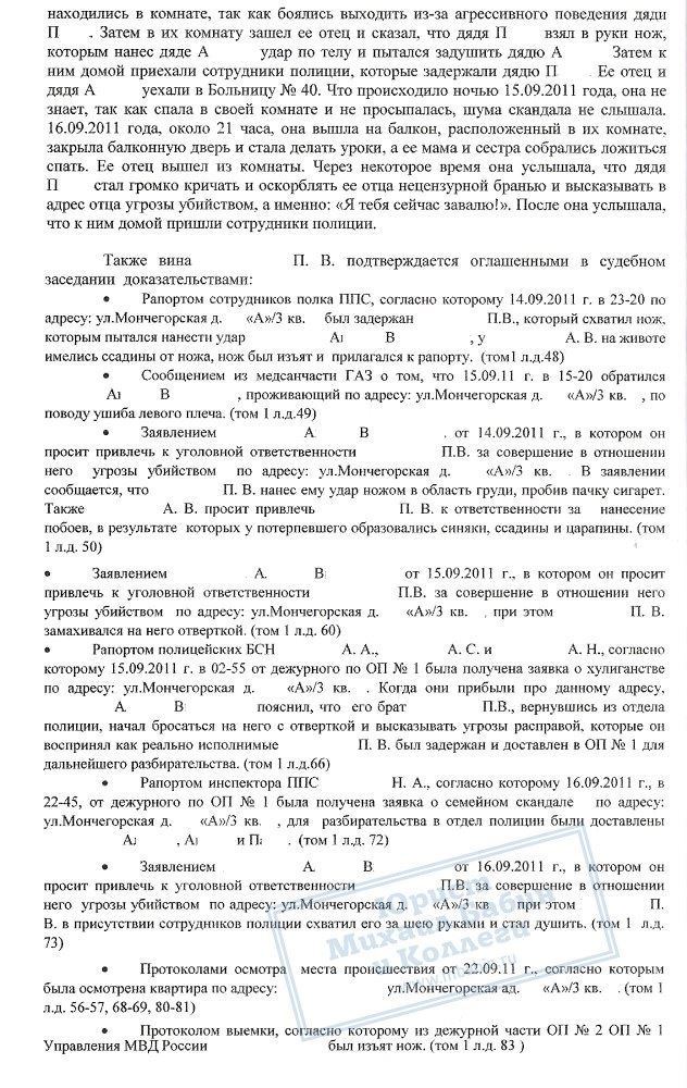 В августе 2013 года руководитель нашей компании проводил защиту по уголовному делу П.В., который неоднократно являлся инициатором конфликтов со своими родственниками на бытовой почве и с причинением вреда здоровью. Данный факт подтвержден всеми свидетелями и потерпевшими по делу, однако сторона обвинения изначально неверно квалифицировала деяния П.В.