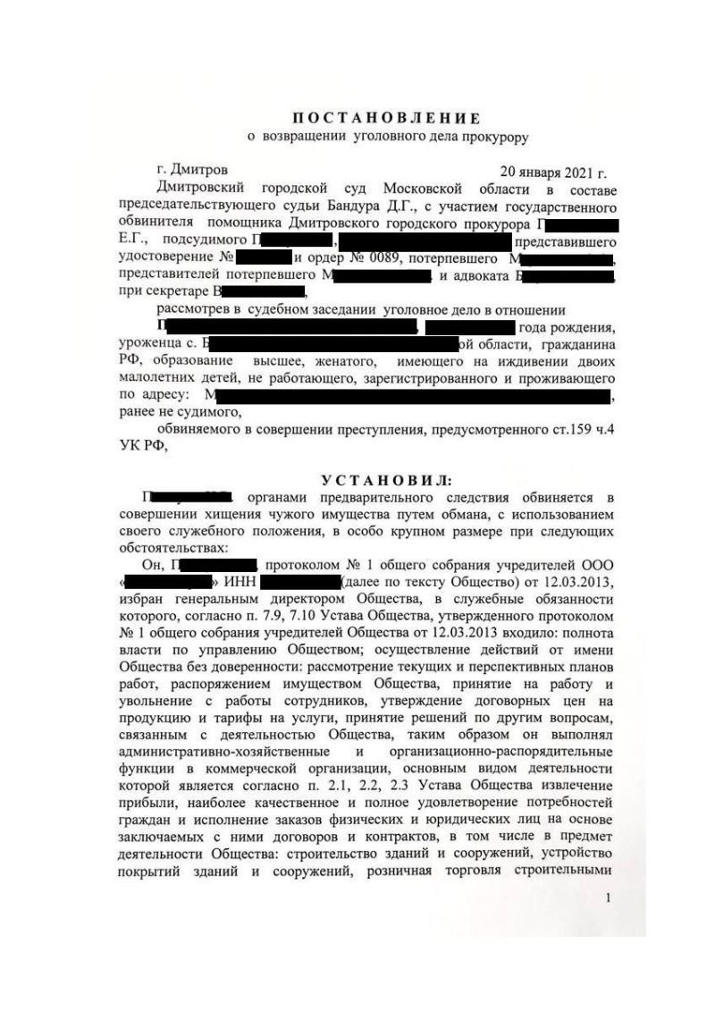 Уголовное дело по обвинению клиента в мошенничестве возвращено прокурору