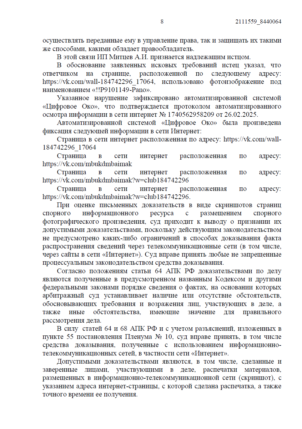 • Факт публикации был зафиксирован не только скриншотами, но и с помощью автоматизированной системы «Цифровое Око», а также нотариального протокола осмотра доказательств.