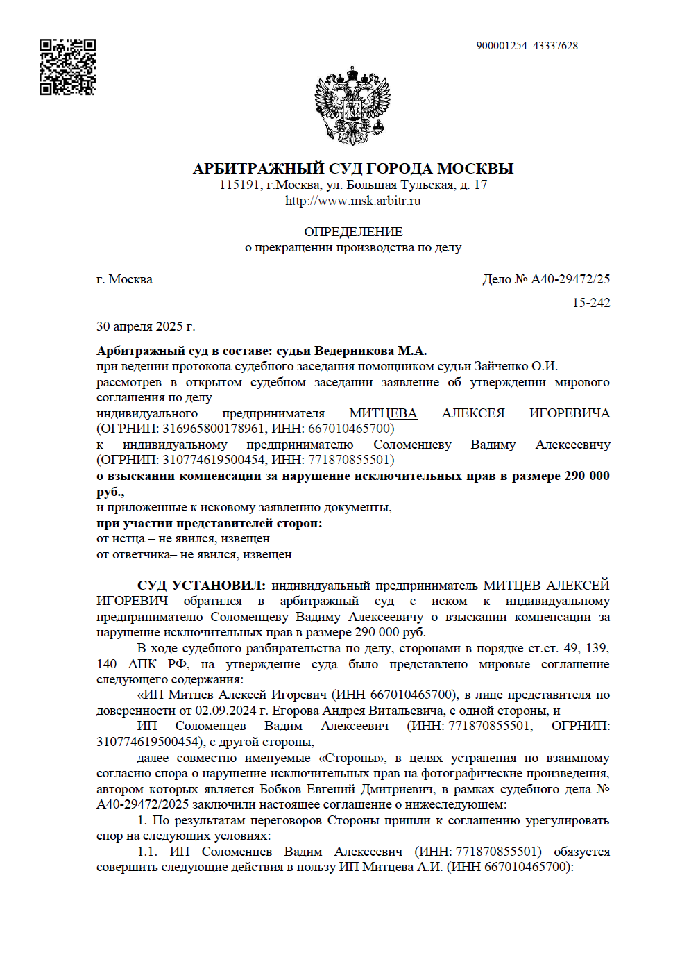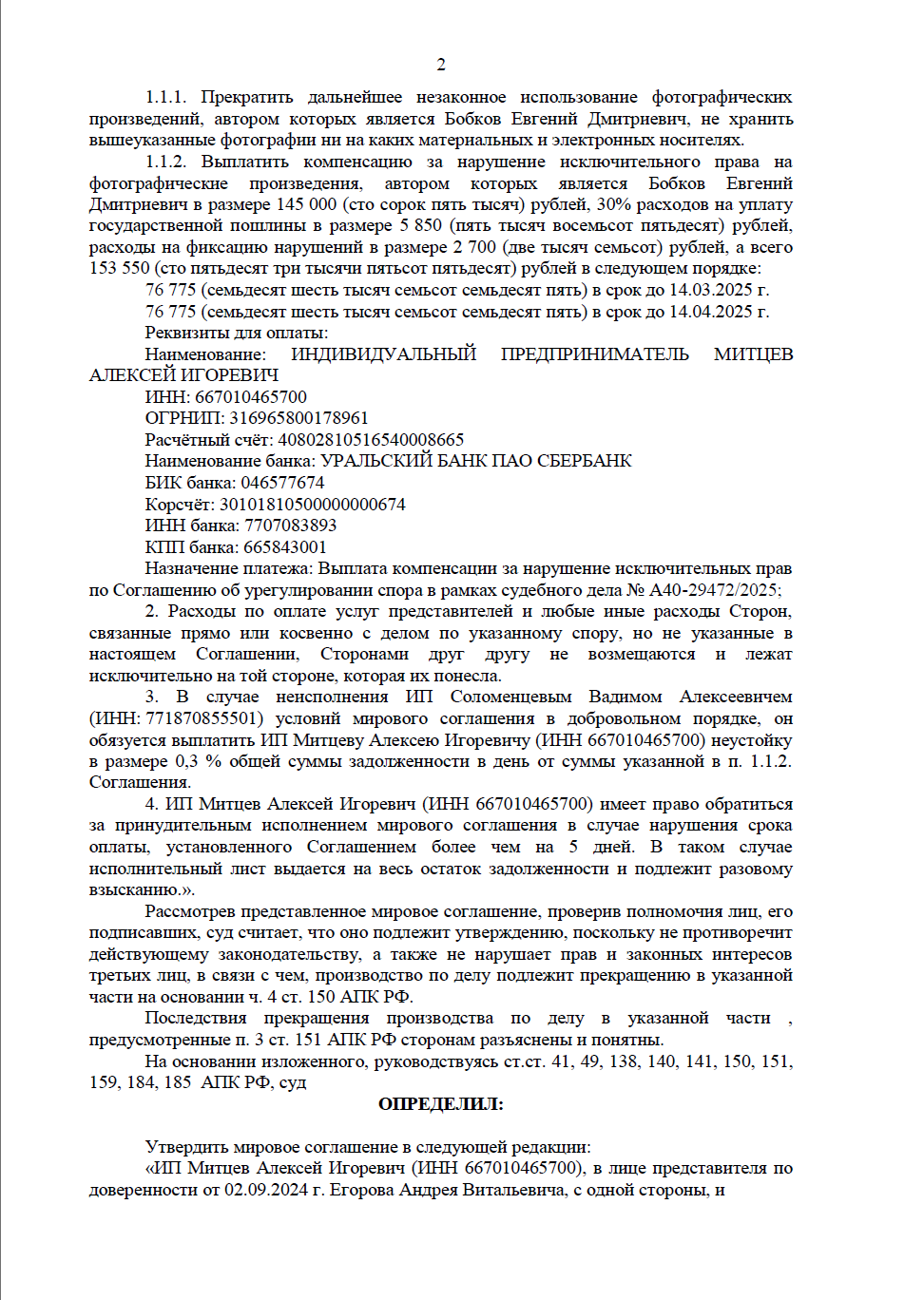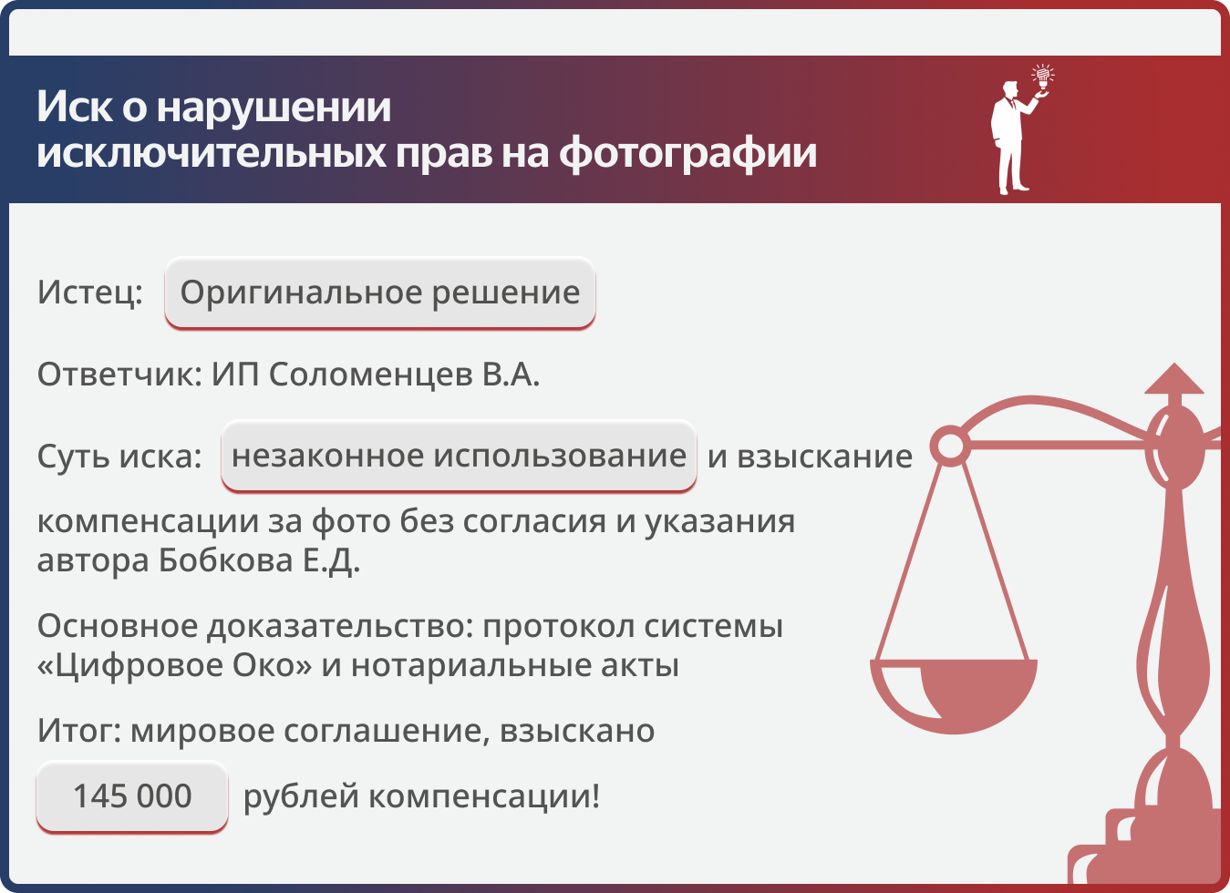 Юристы «Оригинального решения» выявили факт незаконного использования фотографий, автором которых является Евгений Бобков, индивидуальным предпринимателем Соломенцевым В.А.. Изначально мы обратились в Арбитражный суд города Москвы с иском на сумму 290 000 рублей, жестко обозначив свою позицию.