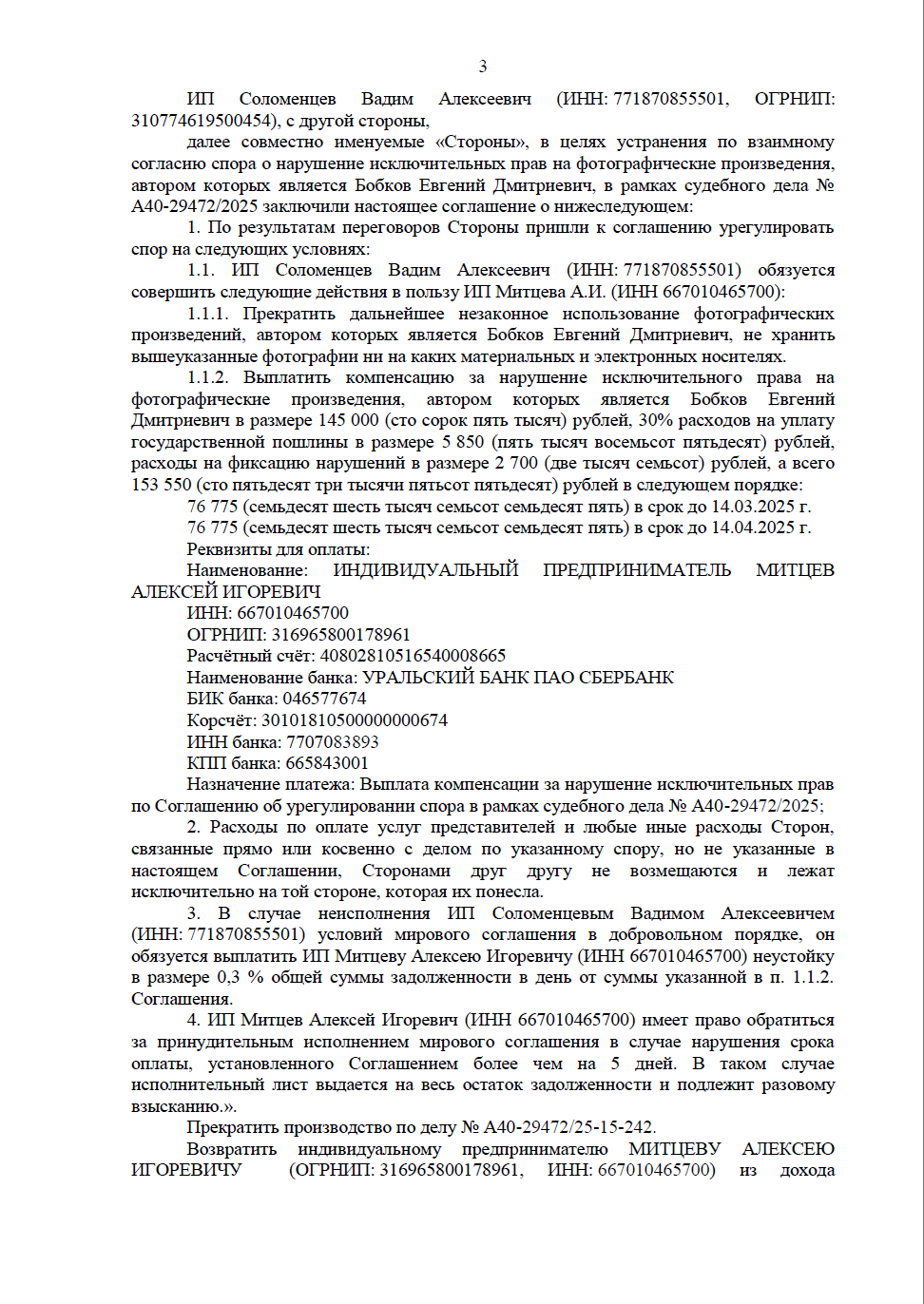 • Компенсация расходов: помимо основной суммы за нарушение прав, нарушитель взял на себя оплату расходов на фиксацию доказательств и части государственной пошлины.